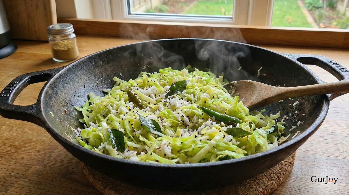 Cabbage provides soluble fiber to support regularity and feed beneficial bacteria. The spices (cumin, mustard seeds) aid digestion and reduce bloating. Fresh grated coconut adds creaminess without heaviness. While not fermented like sauerkraut, it’s a perfect companion to your probiotic ferments. Eat it alongside homemade pickles or kefir for a balanced, joyful gut meal. Low FODMAP-friendly if you limit portions.