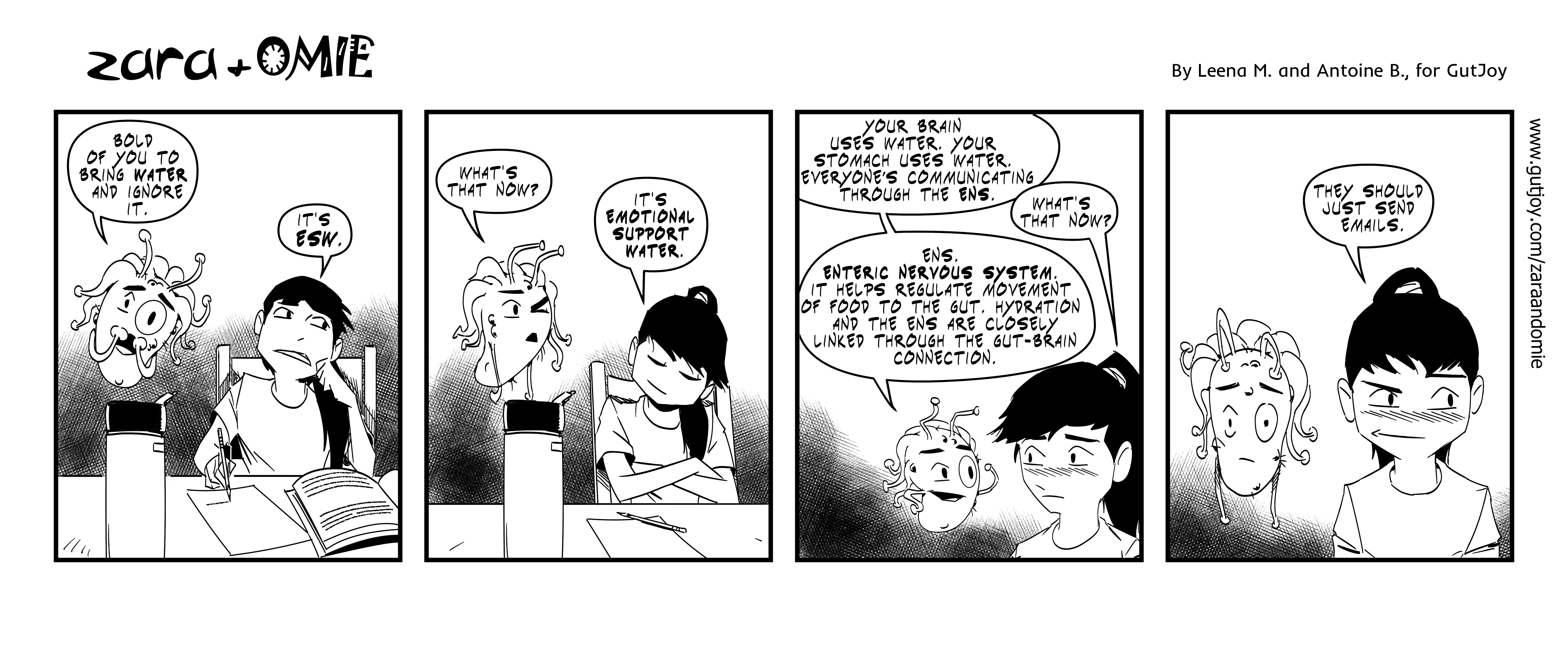 We usually think of water as something we drink when we’re thirsty. But the body uses it throughout the day, especially for communication. The brain and belly are constantly sending signals back and forth through the enteric nervous system, deciding how fast things should move and how strongly to react.