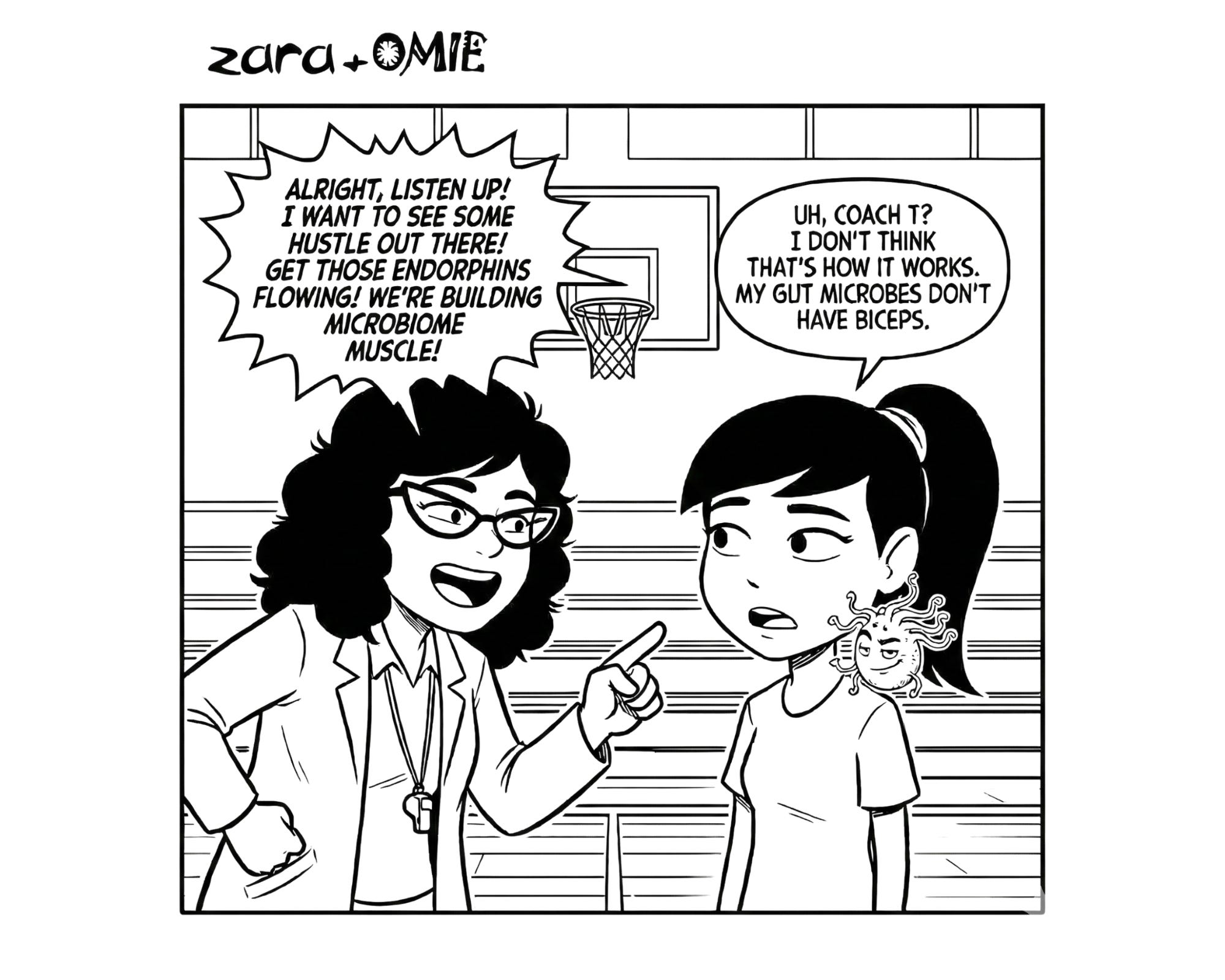 Coach T yells about building microbiome muscle. Zara is politely trying to explain that microbes do not bench-press.