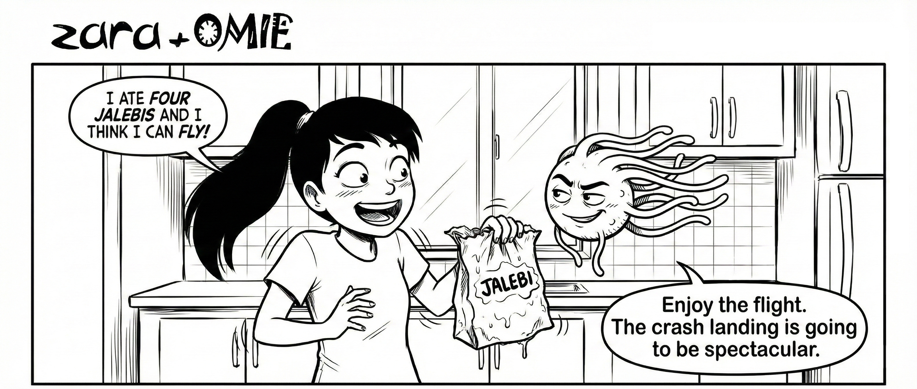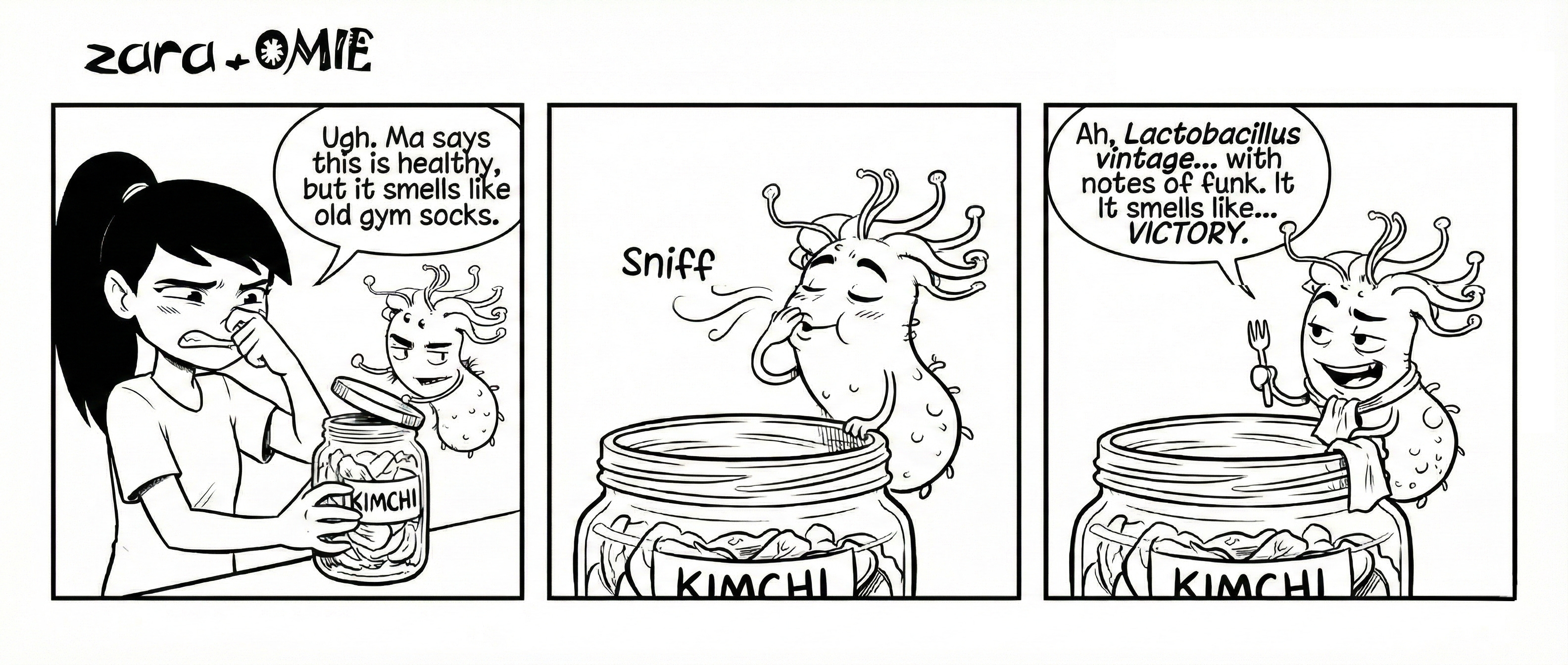 When Zara’s homemade kimchi starts bubbling, her imagination sees tiny defenders getting ready to help. Jay sees something alive and possibly plotting. One kid embraces the microbes… the other retreats to a slice of cheese. Funny how the best foods sometimes look a little too active for comfort.