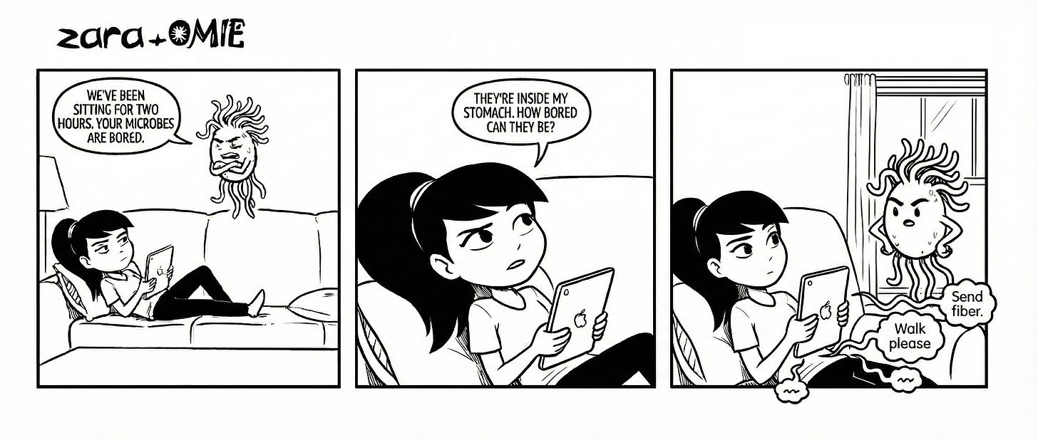 Omie, reminding Zara that microbes prefer real food to fossilized snacks.