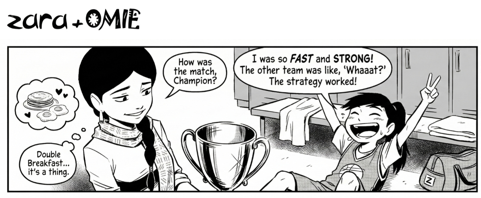While Zara’s friends are ready to call it quits, Omie is busy turning her simple lunch into steady fuel. Real meals + steady breath = more playful energy.