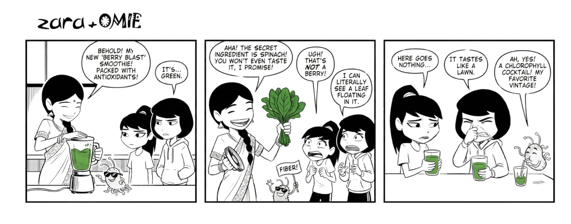 A leafy green surprise that Zara and Misha weren’t prepared to sip. But Omie met it with pure delight, treating the spinach-packed smoothie like a gourmet treat.