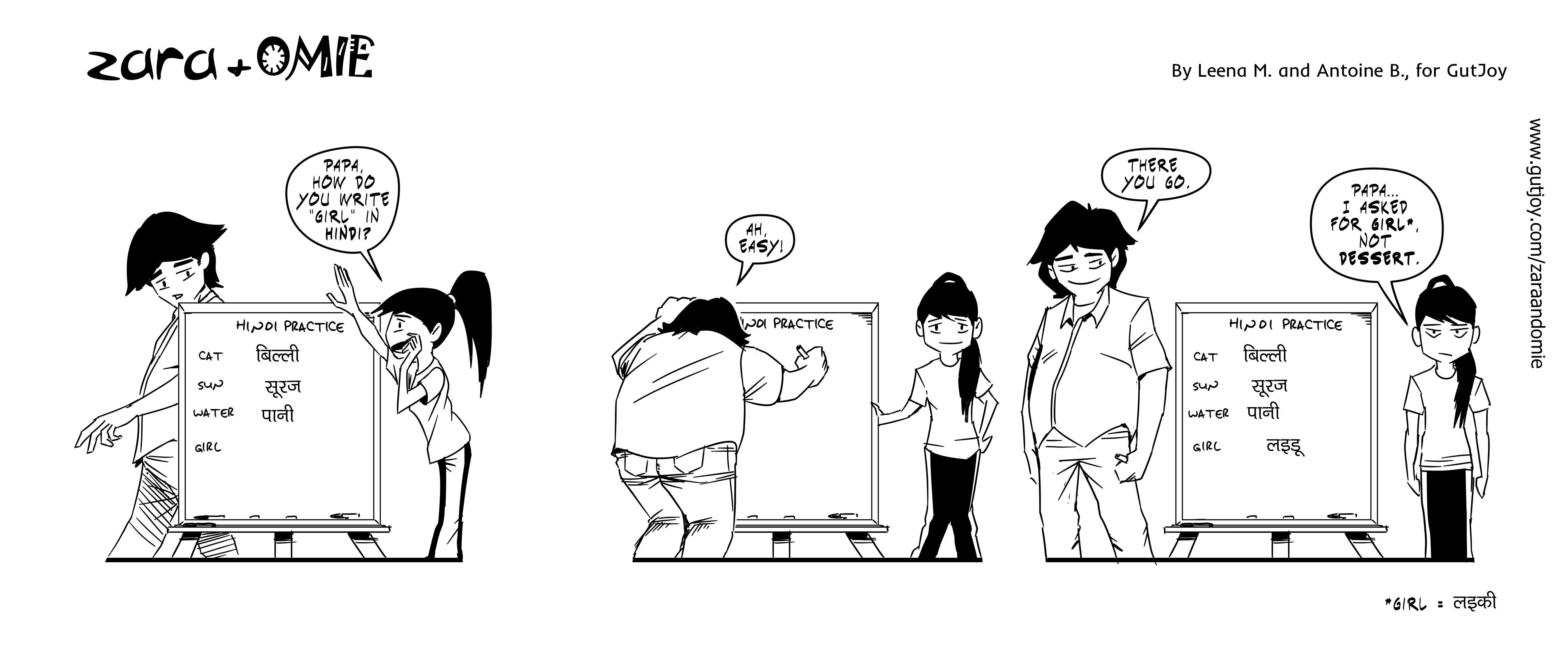 When Zara asked Papa how to write girl in Hindi, his confident answer was… लड्डू. Instead of लड़की (ladki = girl), he proudly wrote laddu. The word for sweet.